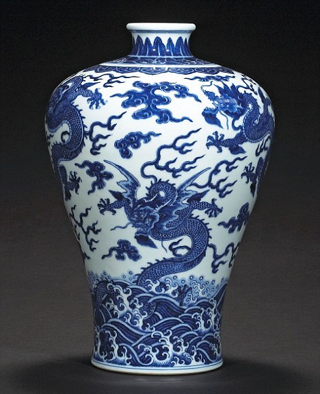 Ένα μικρό με μπλε και άσπρες λεπτομέρειες κινέζικο βάζο, που αναπαριστά τους γνωστούς στην κινέζικη κουλτούρα δράκους πουλήθηκε για περίπου 5 εκατ. αγγλικές λίρες. Η αρχική εκτίμηση του οίκου Bonhams που έκανε τη δημοπρασία για το συγκεκριμένο βάζο ήταν μόλις 10.000 λίρες.