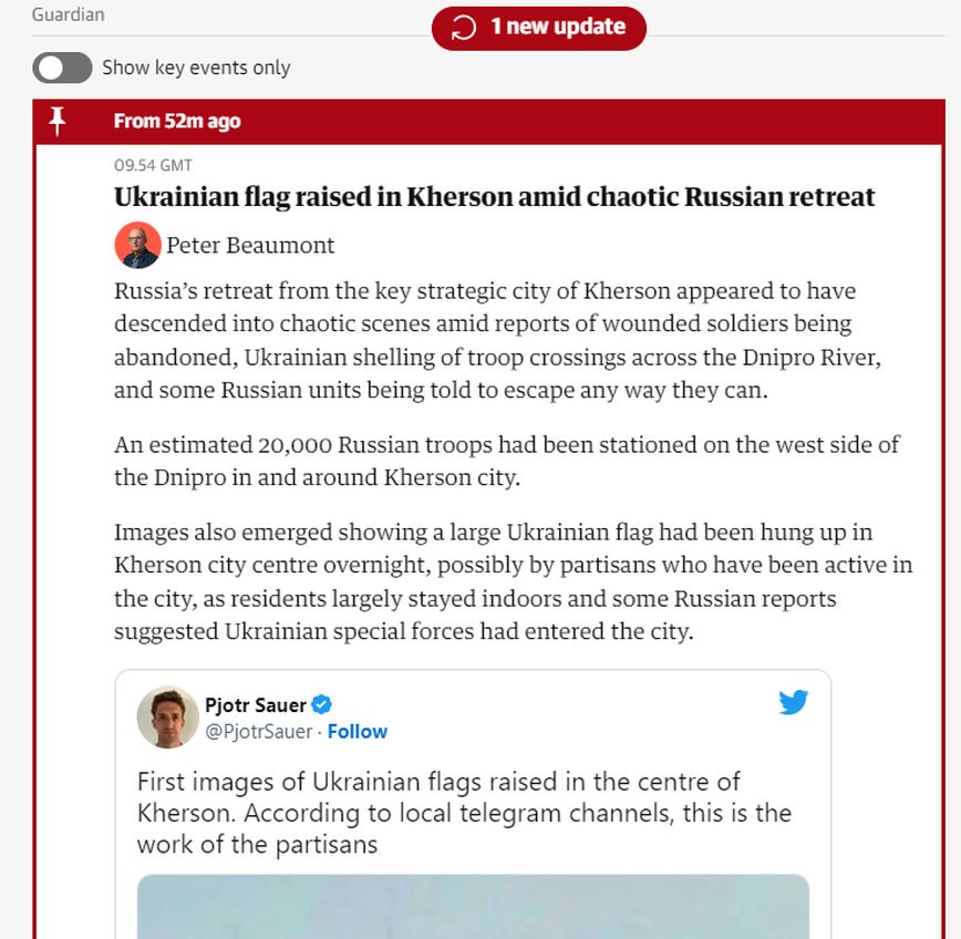 Η ουκρανική σημαία υψώθηκε στη στρατηγικής σημασίας πόλη Χερσώνα, με τις πληροφορίες που μεταδίδει ο βρετανικός Guardian να κάνουν λόγο για εικόνες χάους και αναφορές για τραυματισμένους στρατιώτες που εγκαταλείπονται και ορισμένες μονάδες του ρωσικού στρατού να λαμβάνουν εντολές να αποχωρήσουν με οποιονδήποτε τρόπο μπορούν.