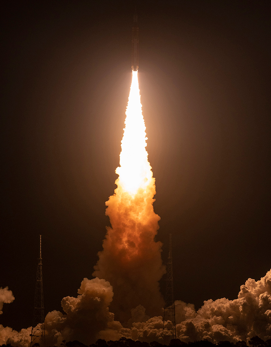 Δύο λεπτά μετά την εκτόξευση, οι δύο λευκοί προωθητικοί πύραυλοι του οχήματος έπεσαν στον Ατλαντικό. Έπειτα από οκτώ λεπτά, ο κύριος όροφος του πυραύλου αποκολλήθηκε με τη σειρά του. Περίπου μιάμιση ώρα μετά την απογείωση, μια τελευταία ώθηση του ανώτερου ορόφου επρόκειτο να βάλει την κάψουλα Orion στο δρόμο για τη Σελήνη, στην οποία θα φθάσει σε μερικές ημέρες.