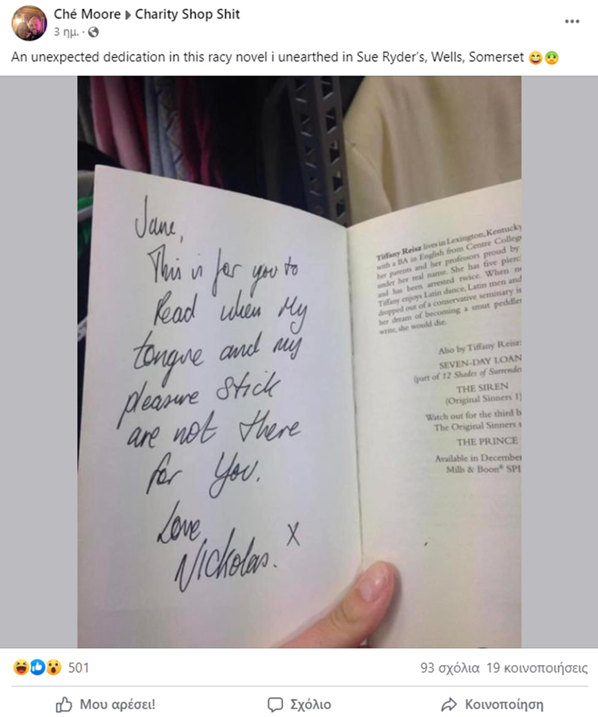 Ένα «πρόστυχο» μήνυμα ανακάλυψε στο εσωτερικό ενός βιβλίου που βρήκε σε ένα κατάστημα με μεταχειρισμένα ένας τύπος στην Αγγλία. Ο Che Moore περιεργαζόταν τα διάφορα αντικείμενα που πωλούνται στο κατάστημα Sue Ryder Wellington στο Σόμερσετ.