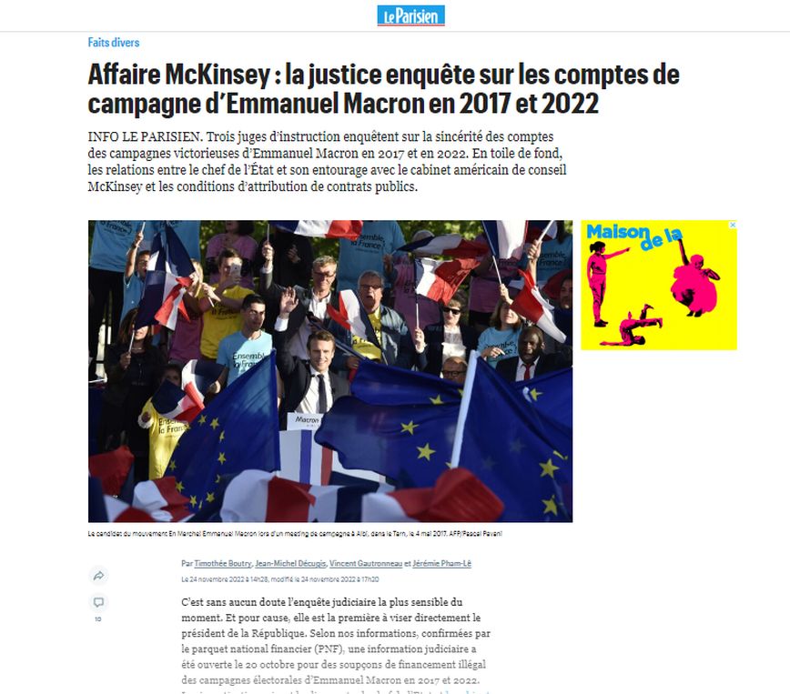 Η έκθεση μιας επιτροπής της Γερουσίας για την αυξανόμενη επιρροή των ιδιωτικών εταιρειών συμβούλων στην πολιτική, ανέφερε ότι οι συμβάσεις που υπέγραψε το κράτος με τέτοιες εταιρείες «υπερδιπλασιάστηκαν» μεταξύ 2018-21, φτάνοντας στο ποσό ρεκόρ του 1 δισεκ. ευρώ το 2021. Η αντιπολίτευση ζήτησε αμέσως να διεξαχθεί έρευνα για τις σχέσεις της μακρονικής πλειοψηφίας με την εταιρεία McKinsey.