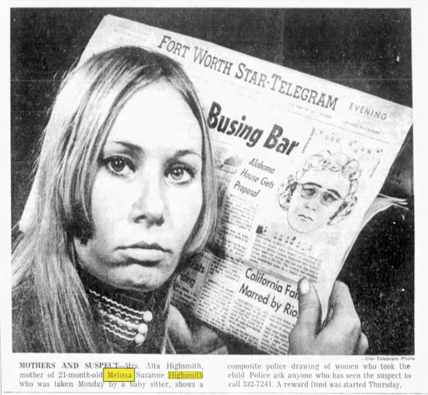 Η κα Walden είπε ότι θα άλλαζε το όνομά της σε Melissa Highsmith και μάλιστα ενημέρωσε τη σελίδα της στο Facebook. Δεν ήταν σαφές ποιος απήγαγε τη Μωρό Μελίσα ή πώς η γυναίκα που την μεγάλωσε έγινε κηδεμόνας της. Η κυρία Walden δεν την κατονόμασε. Με το όνομα Melanie Miyoko, μεγάλωσε και φοίτησε στο Southwest High School στο Fort Worth. Είπε ότι έφυγε από τη νέα της οικογένεια όταν ήταν 15 ετών. «Είχα μια καταχρηστική παιδική ηλικία», είπε. «Αναζητούσα μια καλύτερη ζωή».