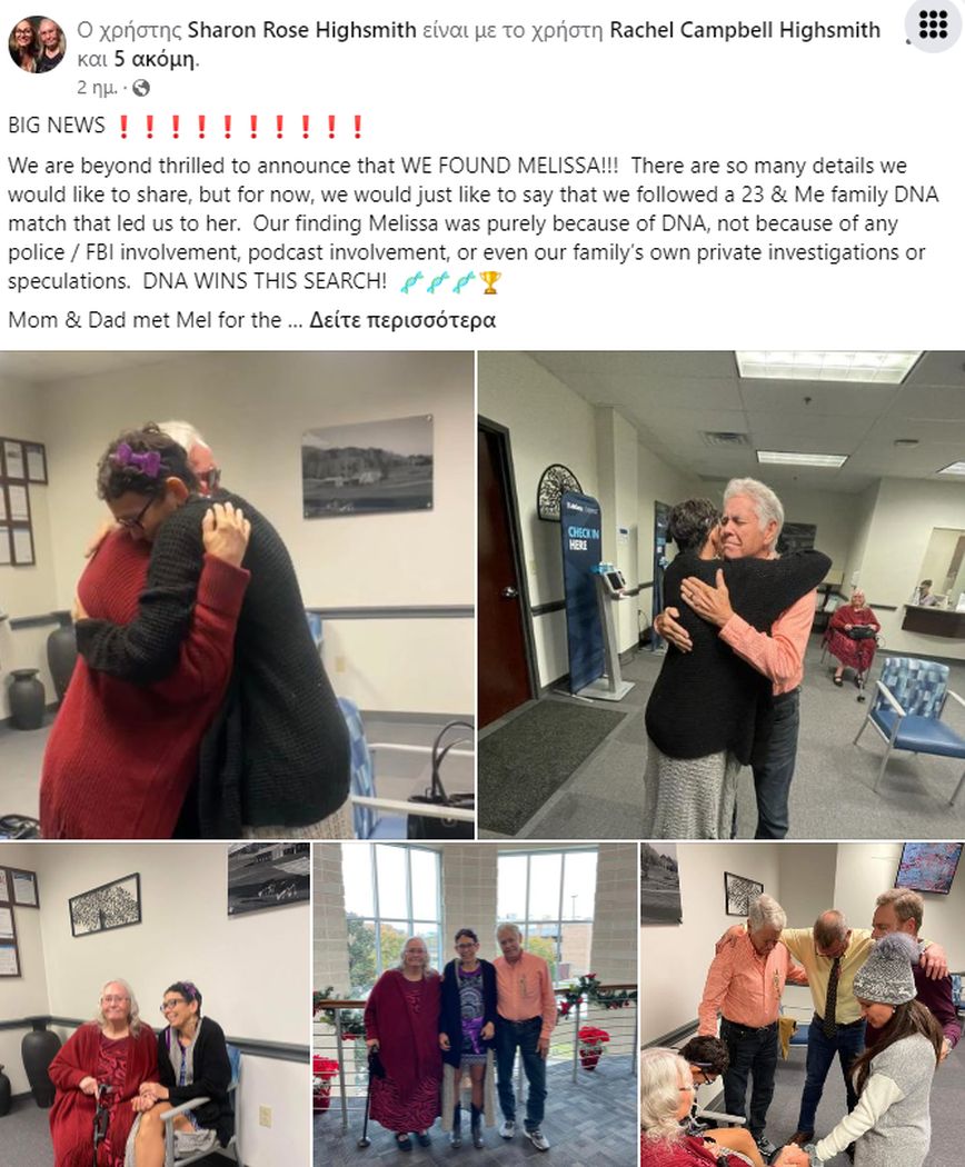 Το μήνυμα στάλθηκε από δύο γυναίκες που είπαν ότι ήταν οι αδερφές της και ένας άντρας που είπε ότι ήταν ο πατέρας της και επέμεναν ότι η Walden είχε απαχθεί όταν ήταν 1 έτους, το 1971 και ότι είχαν περάσει πέντε δεκαετίες, σχεδόν όλη τους τη ζωή , αναζητώντας την. Μάλιστα της είπαν πως είχαν και στοιχεία DNA που το αποδείκνυαν. Η 53χρονη κυρία Walden, που καθαρίζει σπίτια και την τοπική εκκλησία της, έφτιαξε τη ζωή της στο Fort Worth, μετά από αρκετούς γάμους και τρία παιδιά. «Δεν μπορούσα να πιστέψω κάτι τέτοιο», είπε σε συνέντευξή της και μεταδίδου οι New York Times, σε εκτενές ρεπορτάζ. Οι γυναίκες, η Sharon Highsmith και η Rebecca Del Bosque, και ο άνδρας, Jeffrie Highsmith, είπαν στην κυρία Walden ότι το πραγματικό της όνομα ήταν Melissa Highsmith – «Baby Melissa» που βρισκόταν στις αφίσες που είχαν βάλει – και ότι την είχε πάρει μια γυναίκα που υποδυόταν την μπέιμπι σίτερ στο , Fort Worth πριν από πολλές δεκαετίες.