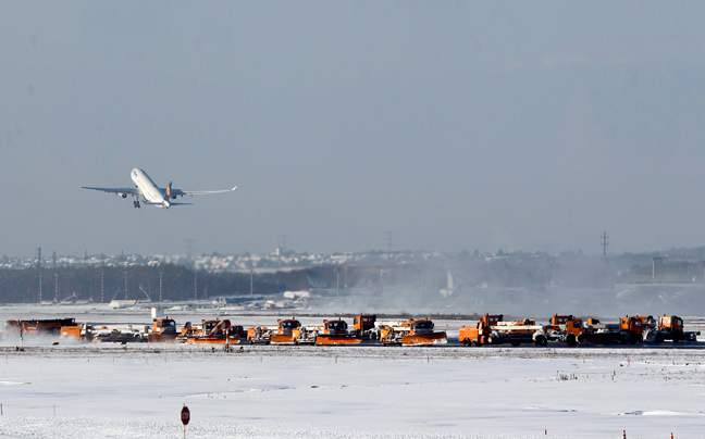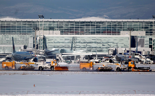 Εκχιονιστικά έκαναν και πάλι την εμφάνισή τους στους αεροδιαδρόμους του αεροδρομίου της Φρανκφούρτης καθώς η σφοδρή χιονόπτωση έντυσε τα πάντα στα λευκά.