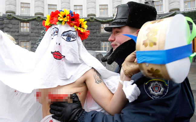 Το… μαγικό χέρι του ένστολου Ουκρανού έπεσε… τυχαία στο γυμνό στήθος της διαδηλώτριας, που με αυτό τον τρόπο θέλησε να διαμαρτυρηθεί για το γεγονός ότι δεν υπάρχει ούτε μία γυναίκα υπουργός στην κυβέρνηση.