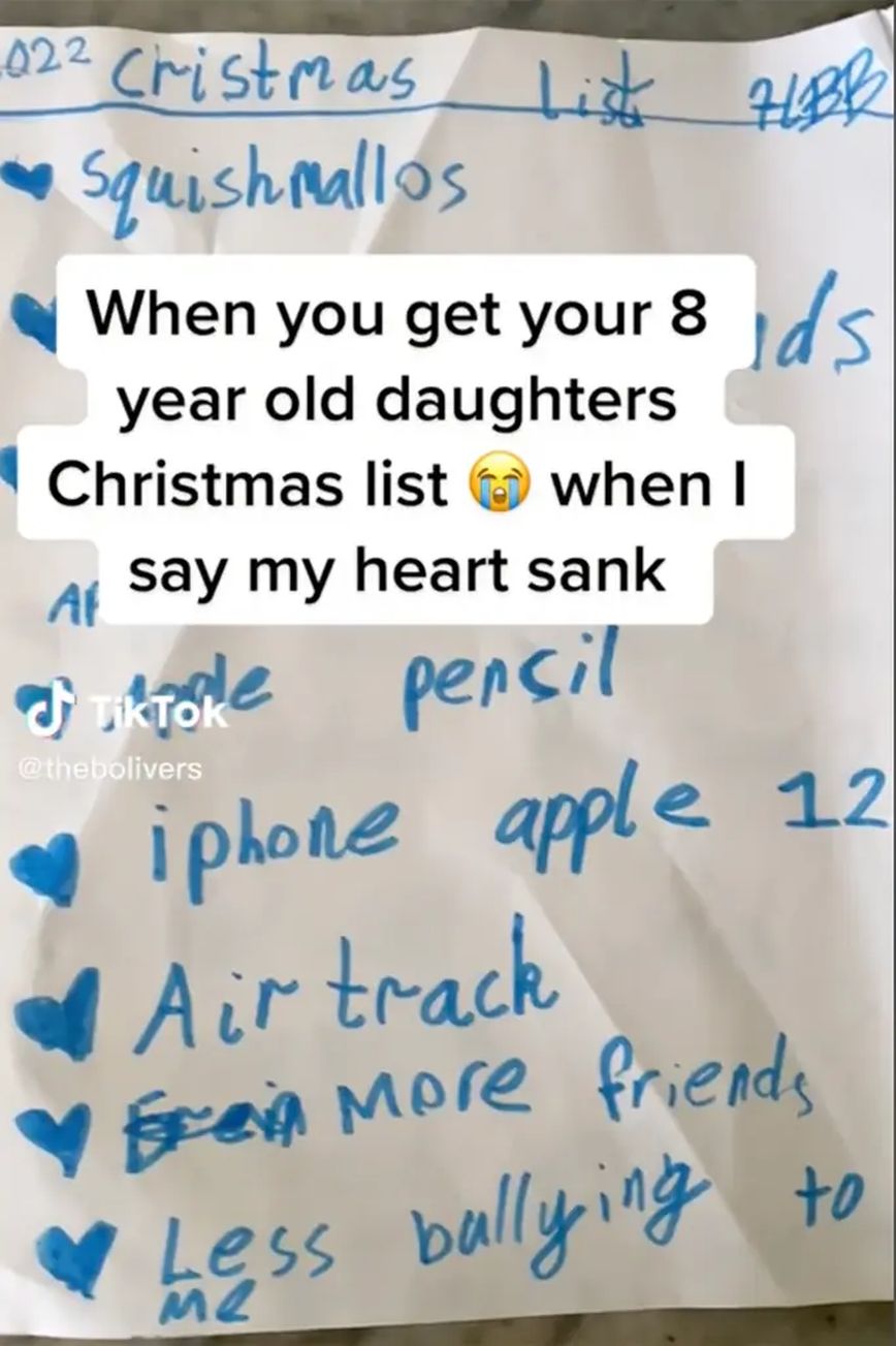Η λίστα συμπεριλάμβανε κι άλλα πράγματα, όπως ένα Apple Pencil και ένα iPhone, όμως στο τέλος της το κορίτσι ζητούσε από τον Άγιο Βασίλη «περισσότερους φίλους» και «λιγότερο bullying σε εμένα».