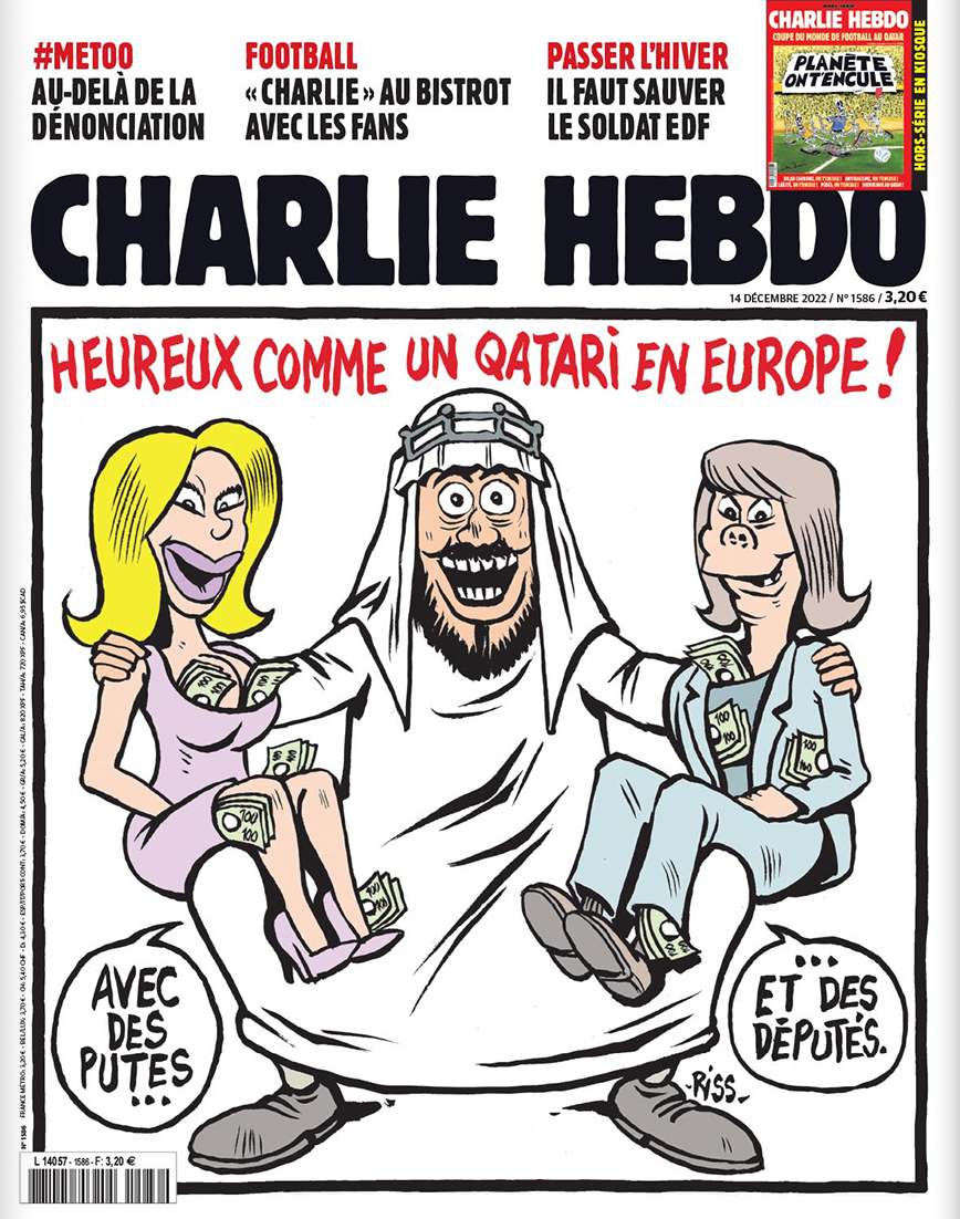 Έτσι, στο εξώφυλλο για το νέο τεύχος του δείχνει έναν ευτυχισμένο Καταριανό Εμίρη, που έχει στα πόδια του δύο γυναίκες με λεφτά τοποθετημένα σε όλο τους το σώμα. Μάλιστα στο τίτλο γράφει: «Ευτυχής σαν Εμίρης του Κατάρ στην Ευρώπη!» και οι δύο γυναίκες λένε «με πόρνες» και με «εκλεγμένες».