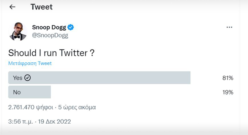 Μέσα σε λίγες ώρες, έχουν ψηφίσει πάνω από 2,2 εκατομμύρια χρήστες του Twitter, εκ των οποίων το 81% λέει «ναι» στον Snoop Dogg ώστε να αγοράσει την πλατφόρμα από τον Έλον Μασκ.