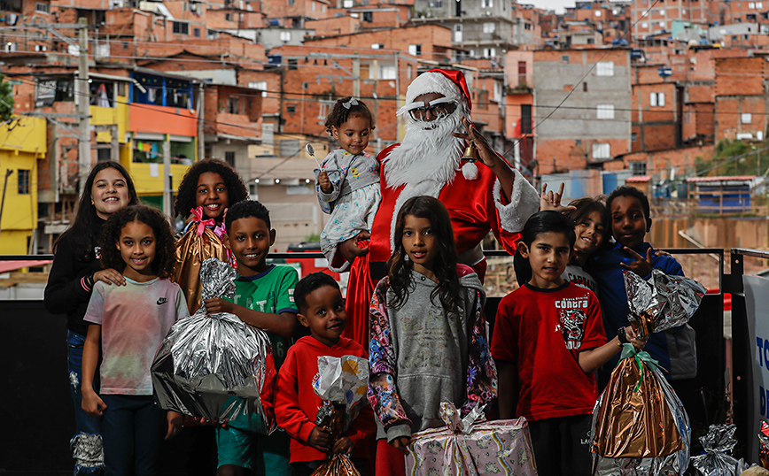 Το χριστουγεννιάτικο πνεύμα εξαπλώνεται από την μία άκρη της γης ως την άλλη και όλα τα παιδιά του κόσμου, αναμένουν με αγωνία την άφιξη του Άγιου Βασίλη. Κάποια παιδιά ικανοποιούνται με ακριβά μόνο δώρα ενώ άλλα αρκούνται με μικρότερες σακούλες. Κι’ όμως η χαρά στο πρόσωπό τους μαρτυρά την αγνότητα των ψυχών τους… Ο Άντερσον Χόρχε, ντυμένος Άγιος Βασίλης, ποζάρει για μια φωτογραφία με τα παιδιά και τα δώρα τους, στην παραγκούπολη Paraisopolis του Σάο Πάολο της Βραζιλίας, Τρίτη 20 Δεκεμβρίου 2022, όπου μοιράστηκαν χριστουγεννιάτικα δώρα σε μερικούς από τους νεαρούς κατοίκους.