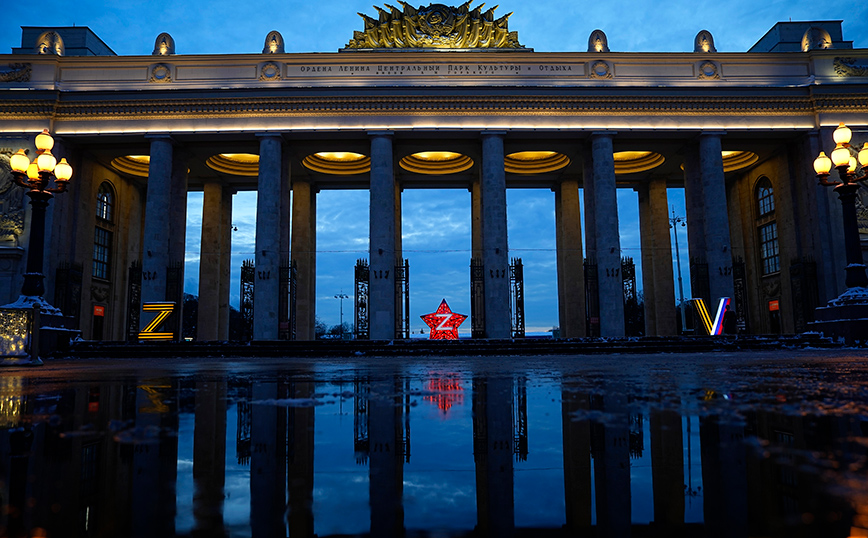 Τα γράμματα «Z» και «V» που συμβολίζουν την ειδική στρατιωτική επιχείρηση της Ρωσίας στην Ουκρανία κοσμούν την είσοδο του πάρκου Γκόρκι που είναι διακοσμημένο για τις γιορτές της Πρωτοχρονιάς και των Χριστουγέννων στη Μόσχα.