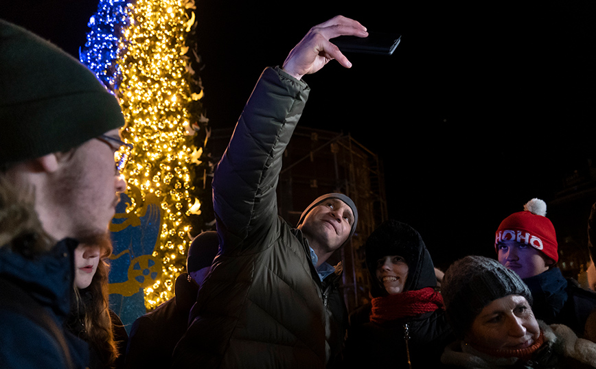 Οι διακοπές των Χριστουγέννων έφτασε, δίνοντας ένα διάλειμμα χαράς και ελπίδας στους Ουκρανούς. Μικρές στιγμές χαράς μέσα στην απόλυτη φρίκη. Στη φωτογραφία ο δήμαρχος Κιέβου Vitali Klitschko ποζάρει για φωτογραφίες με υποστηρικτές κατά τη διάρκεια των εγκαινίων χριστουγεννιάτικου δέντρου στολισμένου με τα χρώματα της ουκρανικής εθνικής σημαίας στο Κίεβο της Ουκρανίας, Δευτέρα, 19 Δεκεμβρίου 2022. Αξιωματούχοι του Κιέβου διαβεβαίωσαν ότι δεν θα επιτρέψουν στη Ρωσία να «κλέψει» τα Χριστούγεννα από τα παιδιά της Ουκρανίας.