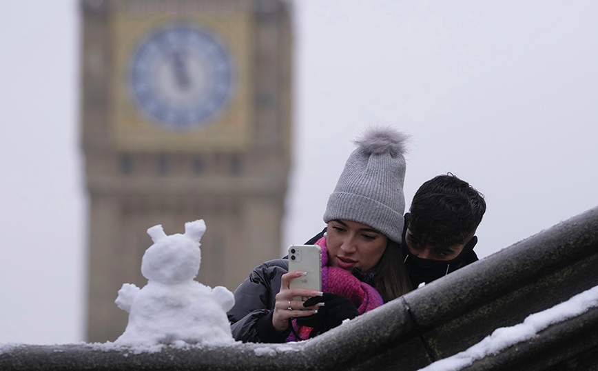Στα λευκά έχει «ντυθεί» το Λονδίνο καθώς σε αρκετές περιοχές της πρωτεύουσας της Αγγλίας σημειώθηκε έντονη χιονόπτωση. Ένα ζευγάρι φωτογραφίζει έναν χιονάνθρωπο στο Λονδίνο, τη Δευτέρα, 12 Δεκεμβρίου. Χιόνι και πάγος έχουν σαρώσει περιοχές του Ηνωμένου Βασιλείου, με τις κρύες χειμωνιάτικες συνθήκες να συνεχίζονται για μέρες.