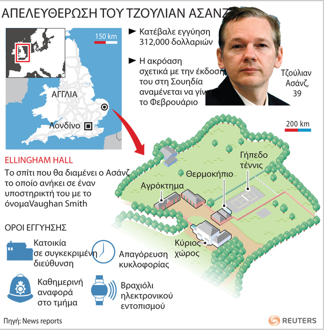Σύμφωνα με τους όρους τις εγγύησης ο Ασάνζ θα πρέπει να μείνει σε ένα σπίτι στην ανατολική Αγγλία, το οποίο ανήκει σε έναν υποστηρικτή του, να εμφανίζεται καθημερινά στο αστυνομικό τμήμα και να φορά ένα βραχιόλι ηλεκτρονικού εντοπισμού.