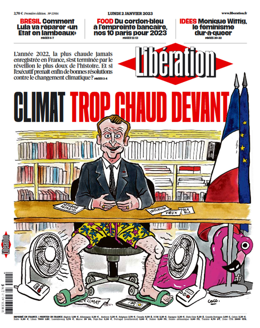Ο Εμανουέλ Μακρόν στις ευχές που έδωσε για το νέο έτος έστειλε και ένα μήνυμα κατά της κλιματικής αλλαγής, όμως η εφημερίδα Liberation σχολίασε ειρωνικά τον Γάλλο πρόεδρο, αφού στο εξώφυλλο της τον απεικονίζει ως τουρίστα στο Ελιζέ.