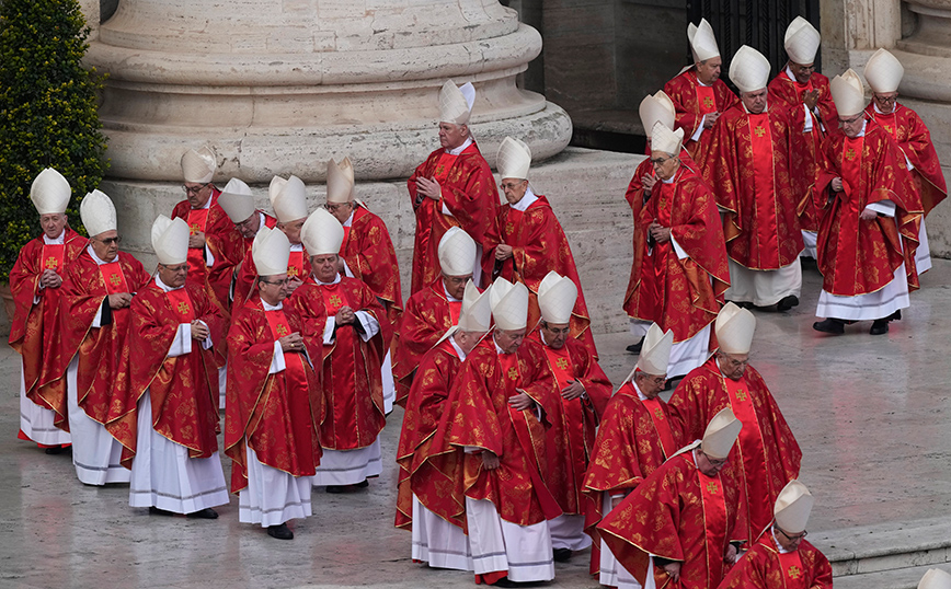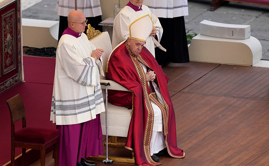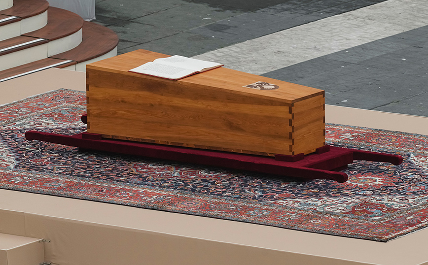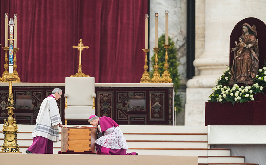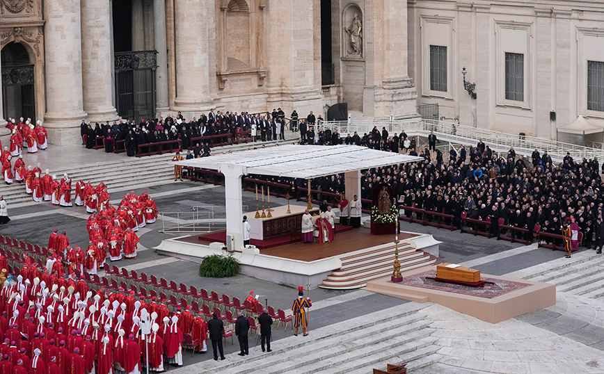 Ο Πάπας Φραγκίσκος έφτασε με αναπηρικό καροτσάκι για να πρωτοστατήσει της τελετής, καθώς αντιμετωπίζει πρόβλημα με το γόνατό του. Κάθισε σε μια καρέκλα κοιτάζοντας το φέρετρο, σκυφτός και με σκυθρωπό πρόσωπο, καθώς οι χορωδίες έψαλαν στα λατινικά.