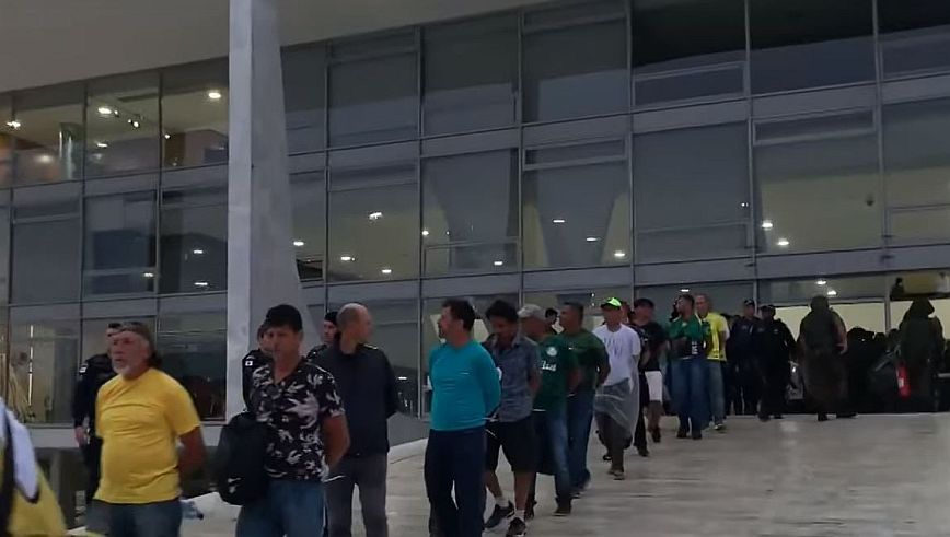 Πλάνα που μετέδωσε το CNN Brasil εικονίζουν μπολσοναριστές, πολλοί από τους οποίους φορούν τα κίτρινα και πράσινα μπλουζάκια της εθνικής ποδοσφαίρου, να βαδίζουν ο ένας πίσω από τον άλλο με τα χέρια δεμένα πισθάγκωνα στη ράμπα που οδηγεί προς και από το προεδρικό μέγαρο Πλανάλτου, φρουρούμενοι από αστυνομικούς.