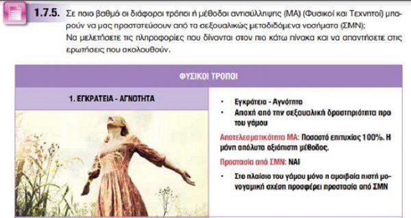 Στο βιβλίο δραστηριοτήτων στη Βιολογία της Γ’ Γυμνασίου οι μαθητές και οι μαθήτριες ενημερώνονται/εκπαιδεύονται (σελ. 68) γύρω από την αντισύλληψη και τις μεθόδους που μπορούν «να μας προστατεύσουν από τα ΣΜΝ».