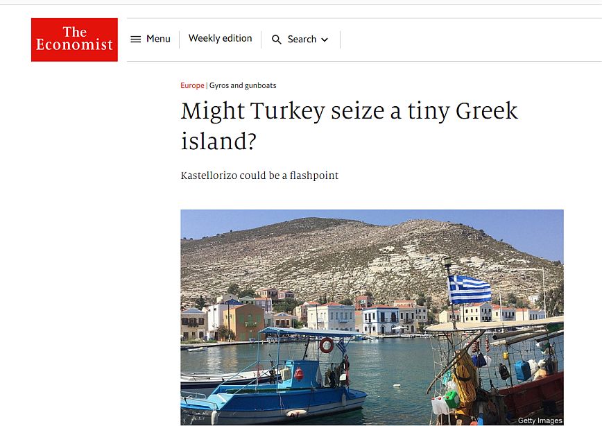 Σύμφωνα με το δημοσίευμα του Economist, η Τουρκία αμφισβητεί την κυριαρχία της Ελλάδας στο Καστελόριζο αλλά και σε ορισμένα άλλα νησιά. Το νησί πρόσφατα βρέθηκε στο επίκεντρο της ελληνοτουρκικής διαμάχης. Η Ελλάδα, στην οποία ανήκει το νησί υποστηρίζει ότι το Καστελόριζο διαθέτει μια περιοχή υφαλοκρηπίδας, ή ΑΟΖ, σύμφωνα με τη Σύμβαση του ΟΗΕ για το Δίκαιο της Θάλασσας.