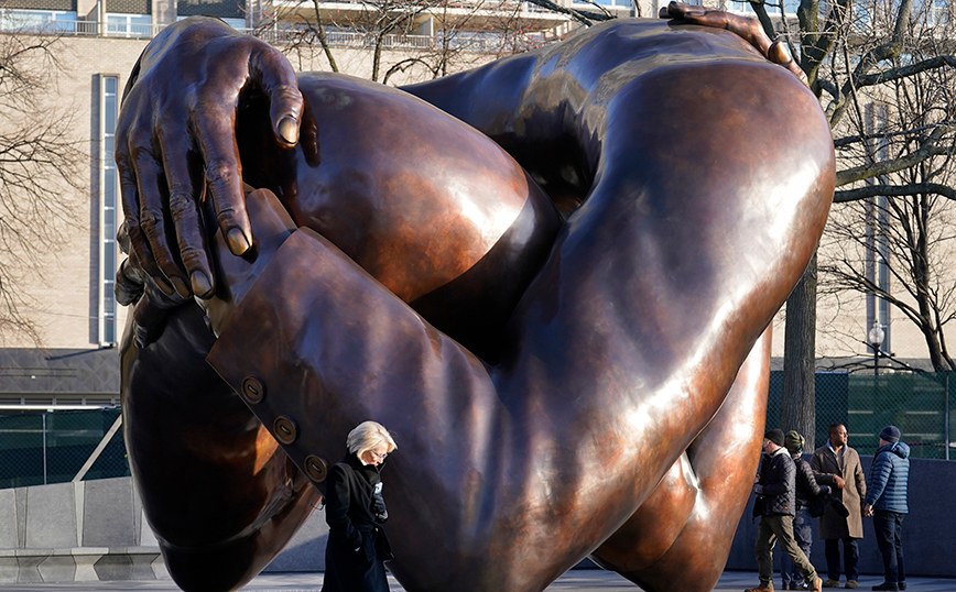 Όπως αναφέρει η nypost.com, πρόκειται για το αφηρημένο έργο τέχνης «The Embrace» που δημιούργησε ο καλλιτέχνης Hank Willis Thomas, ενώ κόστισε 10 εκατομμύρια δολάρια, ποσό που συγκεντρώθηκε από ιδιωτικές δωρεές και χρήματα του Δήμου.