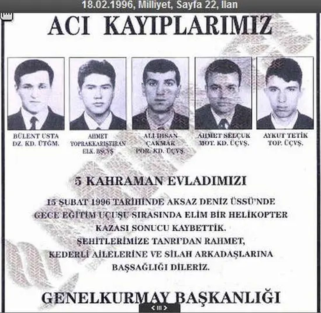 Το ημερολόγιο δείχνει 15 Φεβρουαρίου 1996 και το ελικόπτερο S-70A Black Hawk, στο οποίο έχουν επιβιβαστεί 14 άτομα μαζί με το πλήρωμα στο πιλοτήριο, συντρίβεται κοντά στη Σμύρνη και συγκεκριμένα μέσα στον ναύσταθμο «Ακσάζ». Το αμερικανικής κατασκευής ελικόπτερο, λίγα δευτερόλεπτα μετά την απογείωση του, αρχίζει ξαφνικά να χάνει ύψος και προσκρούει με σφοδρότητα στη θάλασσα. Επί τόπου σκοτώνονται 5 μέλη της SAT, με τα μέσα της γειτονικής χώρας να τους κατονομάζουν: Μπουλέντ Ουστά, Τοπράκ Καριστίρ, Ιχσάν Τσακμάκ, Αχμέτ Σελτσούκ και Αϊκούτ Τετίκ.