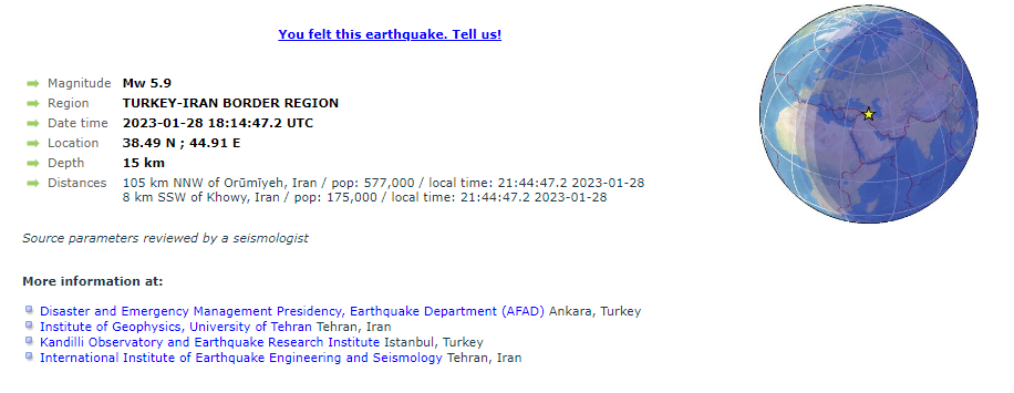 Ο σεισμός καταγράφηκε 105 χλμ. νοτιοδυτικά του Orūmīyeh στο Ιράν και 8 χλμ νότια-νοτιοδυτικά του Khowy στο Ιράν.