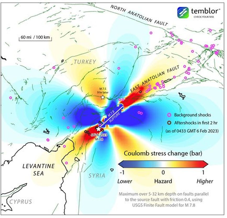 Σε μία ακτίνα μήκους άνω των 300 χιλιομέτρων στο μεγάλο ρήγμα της Ανατολικής Ανατολίας, έχει επεκταθεί η ζώνη όπου είναι πιθανόν να σημειωθούν μετασεισμοί ή άλλοι σεισμοί, μετά τον σεισμό των 7,8 βαθμών που σημειώθηκε τα ξημερώματα της 6ης Φεβρουαρίου και συγκλόνισε το νοτιοανατολικό τμήμα της Τουρκίας και τη Συρία. Πρόκειται για ρήγματα, τα οποία έχουν ωριμάσει και επηρεάζονται από την ανακατανομή των τεκτονικών τάσεων που προκάλεσε η διάρρηξη του κυρίου σεισμού, που εκτείνεται σε μήκος 100 χιλιομέτρων.