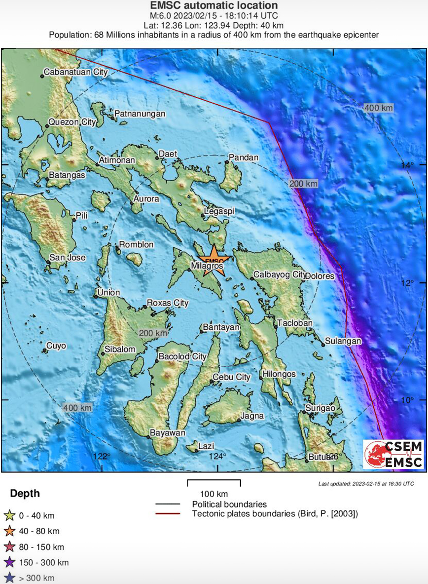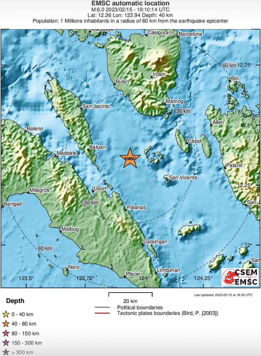 Σεισμική δόνηση μεγέθους 6 βαθμών σημειώθηκε πριν από λίγο στην επαρχία Μασμπάτε των Φιλιππίνων, σύμφωνα με το Ευρωμεσογειακό Σεισμολογικό Κέντρο.