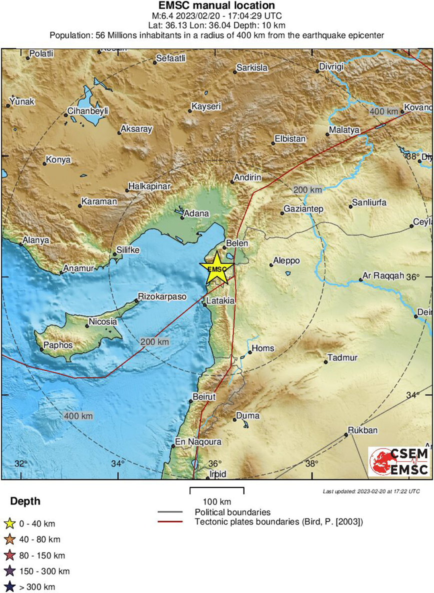 Το επίκεντρό της εντοπίστηκε σε απόσταση 9 χλμ. νοτιοανατολικά της Αντιόχειας στην Τουρκία και 75 χλμ. βόρειονατολικά της Λατάκιας στη Συρία.