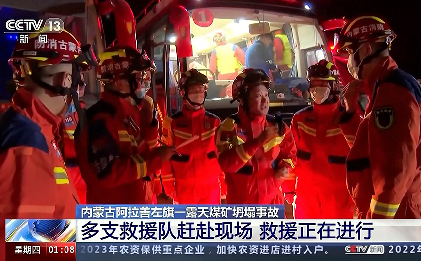 Οι εργαζόμενοι εγκλωβίστηκαν χθες όταν κατέρρευσε τμήμα του υπαίθριου ορυχείου στην περιοχή της Εσωτερικής Μογγολίας, στο βόρειο τμήμα της Κίνας, σύμφωνα με το κρατικό τηλεοπτικό δίκτυο CCTV.