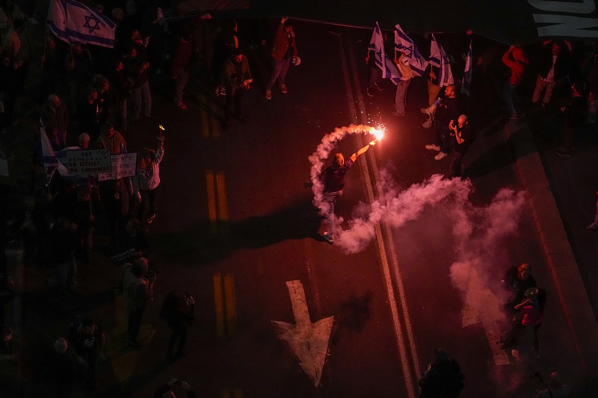 «Δημοκρατία, δημοκρατία!» ή «Δεν θα τα παρατήσουμε», φώναζαν οι διαδηλωτές στο κέντρο του Τελ Αβίβ.