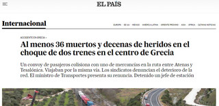 «Τουλάχιστον 36 νεκροί και δεκάδες τραυματίες από τη σύγκρουση δύο τρένων στην κεντρική Ελλάδα», αναφέρει και η El Pais και συμπληρώνει: «Επιβατική αμαξοστοιχία συγκρούστηκε με εμπορική στο δρομολόγιο Αθήνα – Θεσσαλονίκη. Κινούνταν στην ίδια γραμμή. Τα σωματεία καταγγέλλουν φθορά του δικτύου. Ο Υπουργός Μεταφορών υπέβαλε την παραίτησή του. Συνελήφθη ο σταθμάρχης».
