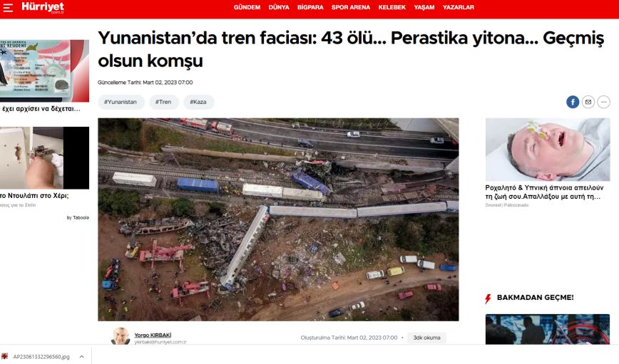 «Perastika Yitona» («Περαστικά γείτονα») είναι ο κεντρικός τίτλος της τουρκικής εφημερίδας Hurriyet που αναφέρεται στο σιδηροδρομικό δυστύχημα των Τεμπών. Η είδηση βρίσκεται σε όλο τον τουρκικό Τύπο με τα άρθρα να αναφέρονται με λόγια συμπόνιας για το δράμα που περνούν οι Έλληνες, ωστόσο μνεία γίνεται και στην παραίτηση του υπουργού Υποδομών και Μεταφορών Κώστα Καραμανλή, η οποία συγκρίνεται με το γεγονός ότι στην γειτονική χώρα με τα χιλιάδες θύματα από τον σεισμό, κανένα μέλος της κυβέρνησης δεν υπέβαλε από ευθιξία την παραίτησή του.
