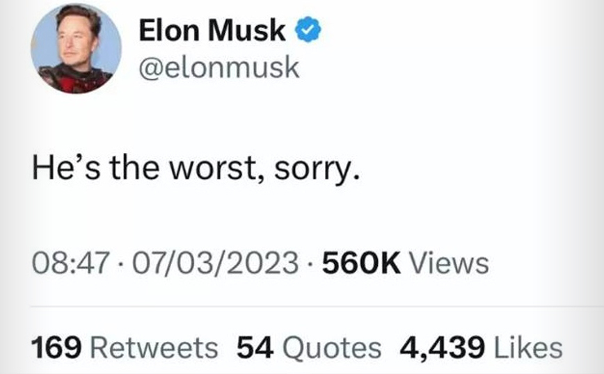«Θα ήθελα να ζητήσω συγγνώμη από τον Halli για την παρεξήγηση της κατάστασής του. Βασίστηκε σε πράγματα που μου είπαν ότι ήταν αναληθή ή, σε ορισμένες περιπτώσεις, αληθινά, αλλά δεν είχαν νόημα. Σκέφτεται να παραμείνει στο Twitter», σημείωσε ο Έλον Μασκ.