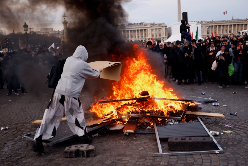 «Ας καταστρέψουμε ό,τι μας καταστρέφει», ήταν ένα από τα συνθήματα που έγραψαν οι διαδηλωτές σε τοίχους. Η αυθόρμητη οργισμένη κινητοποίηση το απόγευμα της Πέμπτης, λίγο μετά την απόφαση του Μακρόν να παρακάμψει το κοινοβούλιο, πραγματοποιήθηκε στη Place de la Concorde του Παρισιού απέναντι από την Εθνοσυνέλευση. «Ο συμβολισμός ήταν ισχυρός: Ήταν εκεί όπου ο στήθηκε η γκιλοτίνα για τον Λουδοβίκος ΙΣΤ’ πριν από 230 χρόνια», σχολιάζει το Reuters σε δημοσίευμά του.