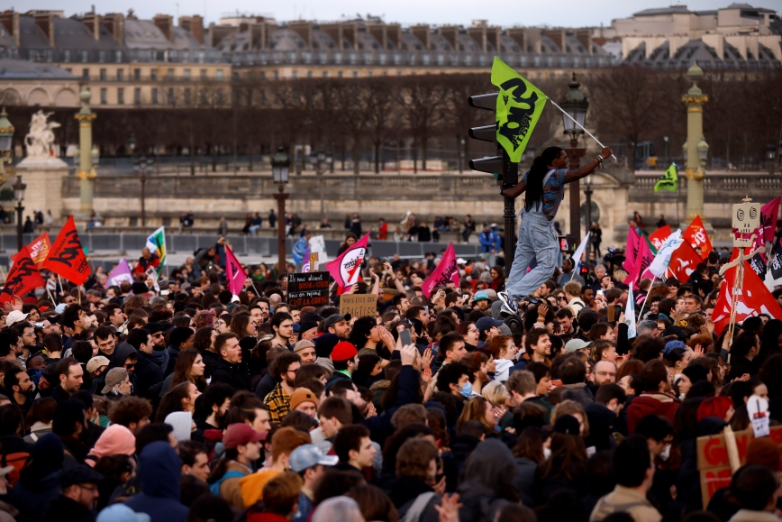 Τα συνδικάτα καλούν σε κλιμάκωση των κινητοποιήσεων, ενώ ο ηγέτης της Αριστεράς, Ζαν Λικ Μελανσόν, δήλωσε πως «υποστηρίζει και ενθαρρύνει τους πολίτες να κατέβουν στους δρόμους». Η κυβέρνηση επιμένει πως η μεταρρύθμιση είναι αναγκαία για να μην καταρρεύσει το συνταξιοδοτικό σύστημα, χωρίς όμως να πείθει τη πλειονότητα των Γάλλων. Πάνω από 8 στους 10 πολίτες εκφράζουν τη δυσαρέσκειά τους με τα σχέδια της κυβέρνησης και την απόφασή να παρακαμφθεί η ψηφοφορία στο κοινοβούλιο. Το 65% δηλώνει πως επιθυμεί να συνεχιστούν οι απεργίες και οι διαμαρτυρίες.
