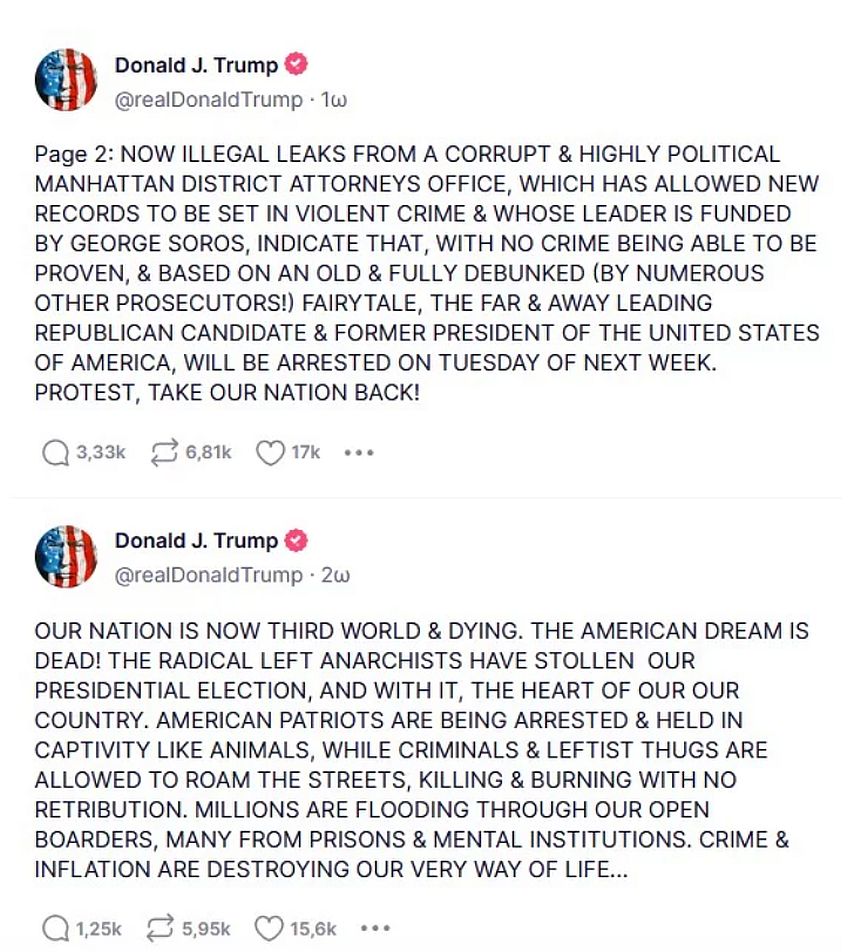 Ο Τραμπ ανέφερε σε ανάρτησή του στο κοινωνικό του δίκτυο Truth νωρίς το Σάββατο ότι «παράνομες διαρροές» από το γραφείο του εισαγγελέα του Μανχάταν δείχνουν ότι «Ο μεγαλύτερος Ρεπουμπλικανός υποψήφιος και πρώην πρόεδρος των Ηνωμένων Πολιτειών της Αμερικής θα συλληφθεί την Τρίτη της επόμενης εβδομάδας».