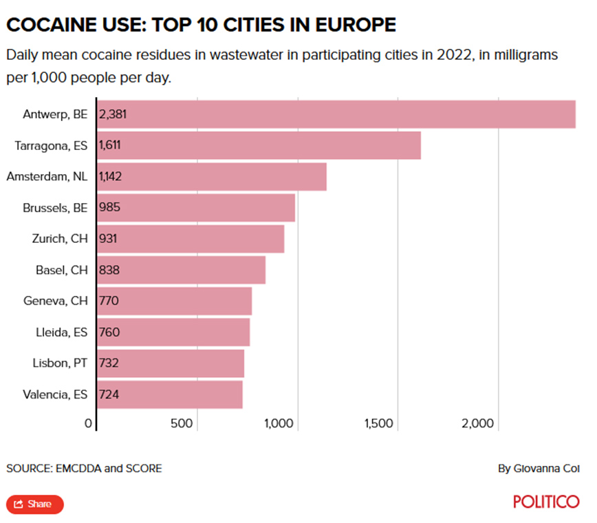 Πιο αναλυτικά, οι άνθρωποι που ζουν στη δεύτερη πόλη του Βελγίου βρίσκονται στην κορυφή του πίνακα για την κατανάλωση κοκαΐνης στην Ευρώπη, σύμφωνα με ανάλυση που δημοσιεύθηκε την Τετάρτη από τον οργανισμό ναρκωτικών της ΕΕ (EMCDDA) και την ομάδα SCORE, η οποία αξιολόγησε τα λύματα από περίπου 54 εκατομμύρια ανθρώπους πέρυσι σε περισσότερες από 100 συμμετέχουσες ευρωπαϊκές πόλεις. Ο όγκος των υπολειμμάτων κοκαΐνης ήταν υψηλότερος τις Δευτέρες, αντανακλώντας ότι — στην Αμβέρσα τουλάχιστον — το ναρκωτικό χρησιμοποιείται περισσότερο τις Κυριακές και τις Δευτέρες.