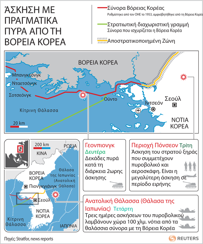 Νέα ένταση στην κορεατική χερσόνησο αναμένεται να πυροδοτήσει η άσκηση με αληθινά πυρά στην οποία προχώρησε η Νότια Κορέα. Η Σεούλ, σε μία επίδειξη δύναμης, ανακοίνωσε στρατιωτικά γυμνάσια στα ανοικτά των ανατολικών ακτών της χερσονήσου, κοντά στην στρατιωτικοποιημένη μεθόριο με τη Βόρεια Κορέα.