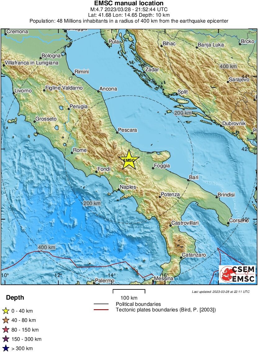 Σεισμός μεγέθους 4,7 βαθμών της κλίμακας Ρίχτερ σημειώθηκε λίγο πριν τα μεσάνυχτα στην περιφέρεια Μολίσε της Ιταλίας, σύμφωνα με Ευρωμεσογειακό Σεισμολογικό Ινστιτούτο.