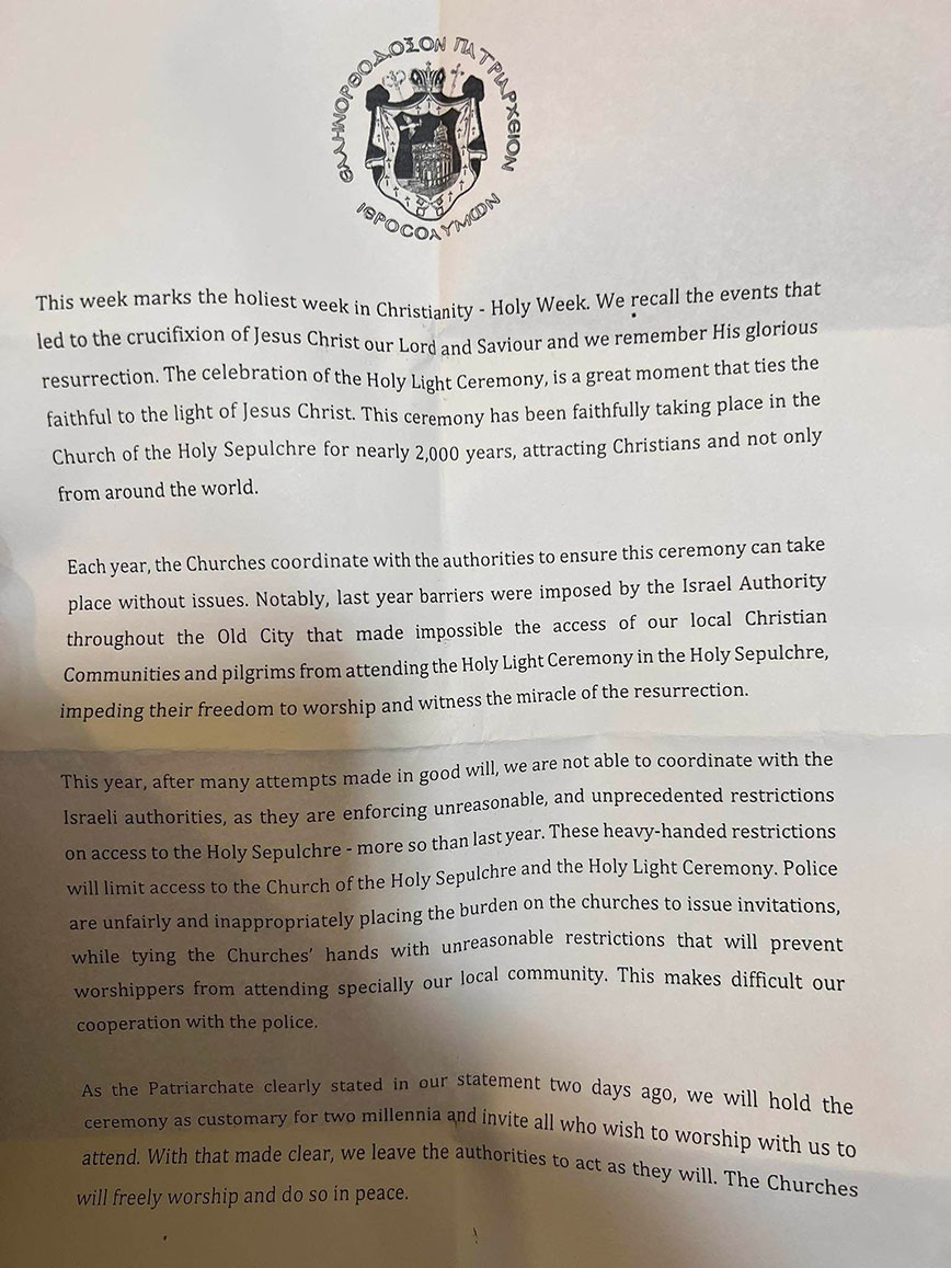 Φέτος, μετά από πολλές προσπάθειες που έγιναν καλή τη πίστει, δεν μπορέσαμε να συντονιστούμε με τις ισραηλινές αρχές, καθώς αυτές επιβάλλουν παράλογους και πρωτοφανείς περιορισμούς στην πρόσβαση στον Πανάγιο Τάφο, περισσότερο από πέρυσι. Αυτοί οι σκληροί περιορισμοί θα περιορίσουν την πρόσβαση της εκκλησίας στο Παναγίο Τάφο και την τελετή Αφής του Αγίου Φωτός. Η αστυνομία άδικα και ανάρμοστα ρίχνει το βάρος στις εκκλησίες (να προσκαλέσουν εκείνες συγκεκριμένα άτομα), ενώ δένει τα χέρια των εκκλησιών με παράλογους περιορισμούς που θα εμποδίσουν τους πιστούς να παρευρεθούν, ειδικά στην αγαπημένη μας κοινότητα.