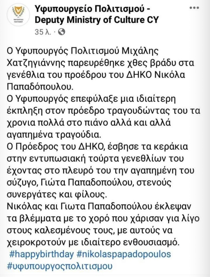 «O Υφυπουργός Πολιτισμού Μιχάλης Χατζηγιάννης παρευρέθηκε χθες βράδυ στα γενέθλια του προέδρου του ΔΗΚΟ Νικόλα Παπαδόπουλου.