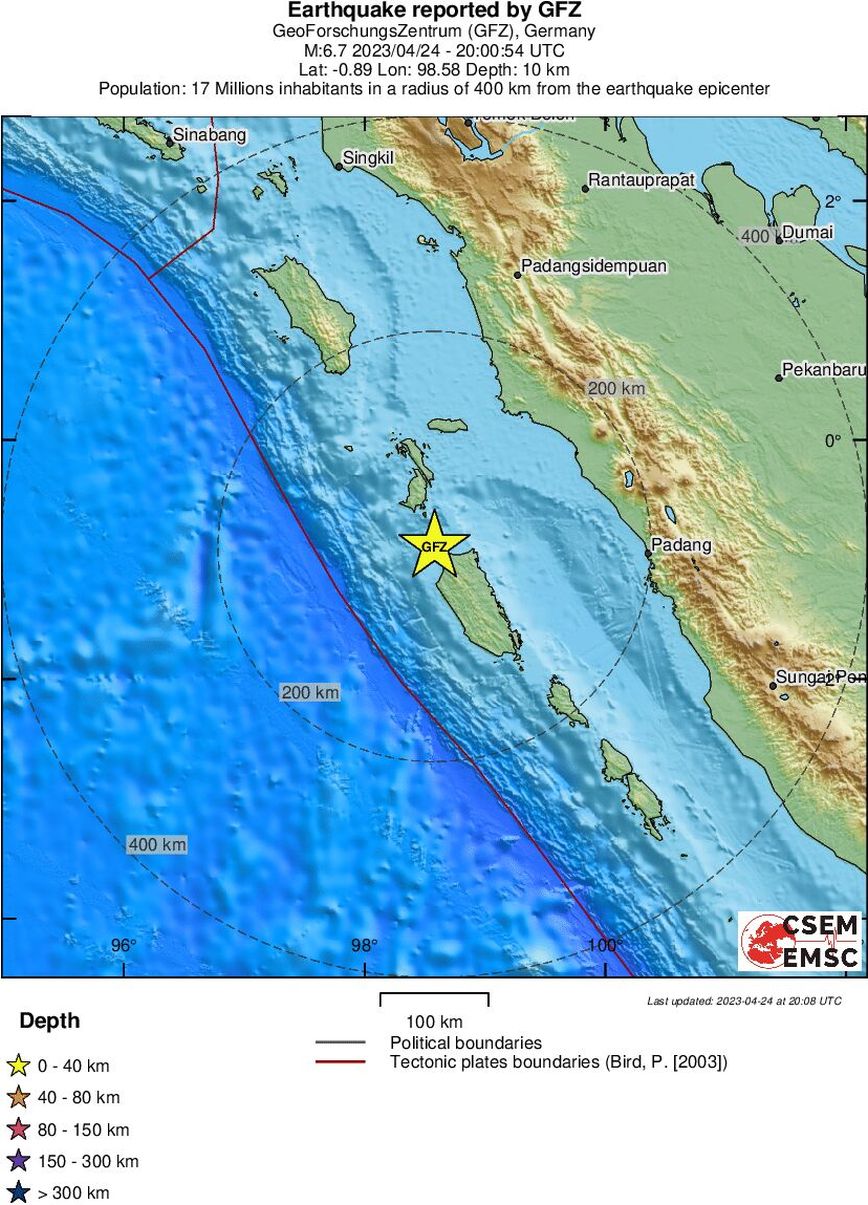 Το Ευρωμεσογειακό Σεισμολογικό Κέντρο (EMSC) είχε εκτιμήσει πως ο σεισμός ήταν μεγέθους 6,8 βαθμών. Το επίκεντρο του σεισμού εντοπίζεται 193 χιλιόμετρα δυτικά της πόλης Παντάνγκ και το εστιακό βάθος υπολογίζεται σε 30 χιλιόμετρα, σύμφωνα με το EMSC.
