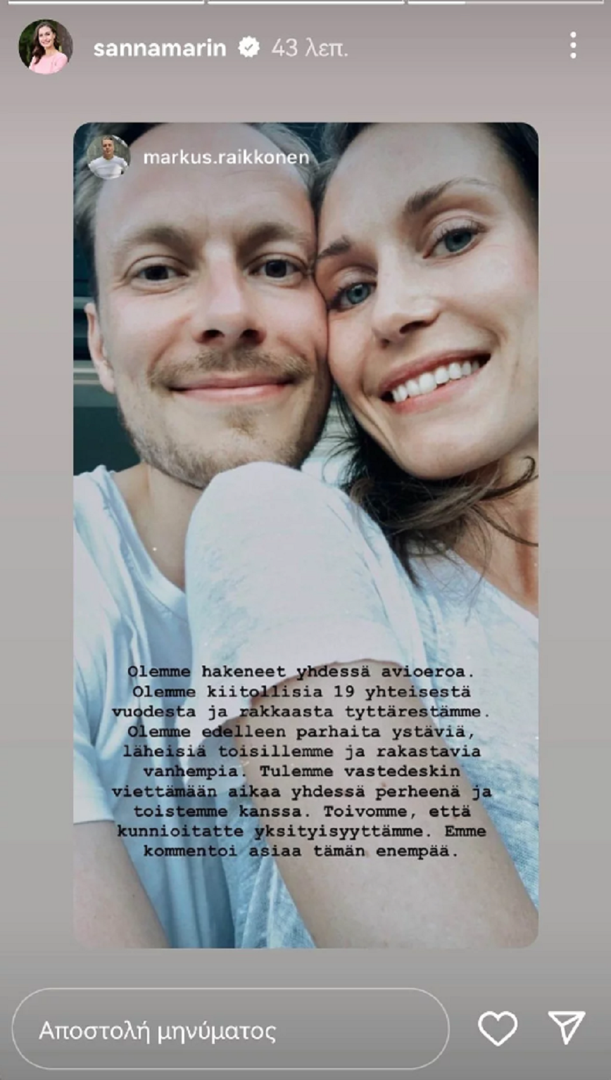 Μάλιστα, η Σάνα Μαρίν έκανε story στο Instagram με το οποίο ανακοίνωσε τον χωρισμό, γράφοντας τα εξής: