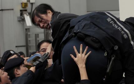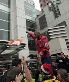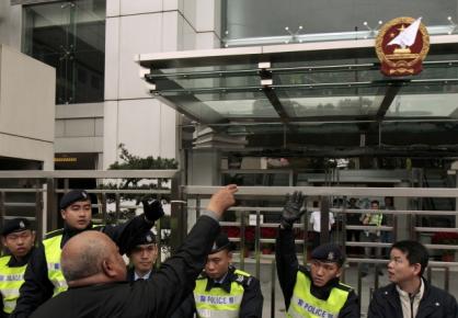 Οι διαδηλωτές κρατούσαν πανό και φώναζαν συνθήματα έξω από το κτίριο του Γραφείου Σύνδεσης ζητώντας από την Κίνα να απελευθερώσει τον Λιου.