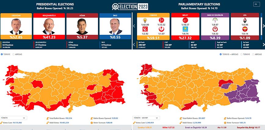 Ο Ρετζέπ Ταγίπ Ερντογάν προηγείται με ποσοστό 52,70% με καταμετρημένο το 40,04% των ψήφων. Ο μεγάλος αντίπαλος του Τούρκου προέδρου και υποψήφιος έξι κομμάτων της αντιπολίτευσης Κεμάλ Κιλιτσντάρογλου λαμβάνει ποσοστό 41,39%. Ο τρίτος υποψήφιος Σινάν Ογάν συγκεντρώνει ποσοστό 5,36% και ο Μουχαρέμ Ιντζέ 0,55%.