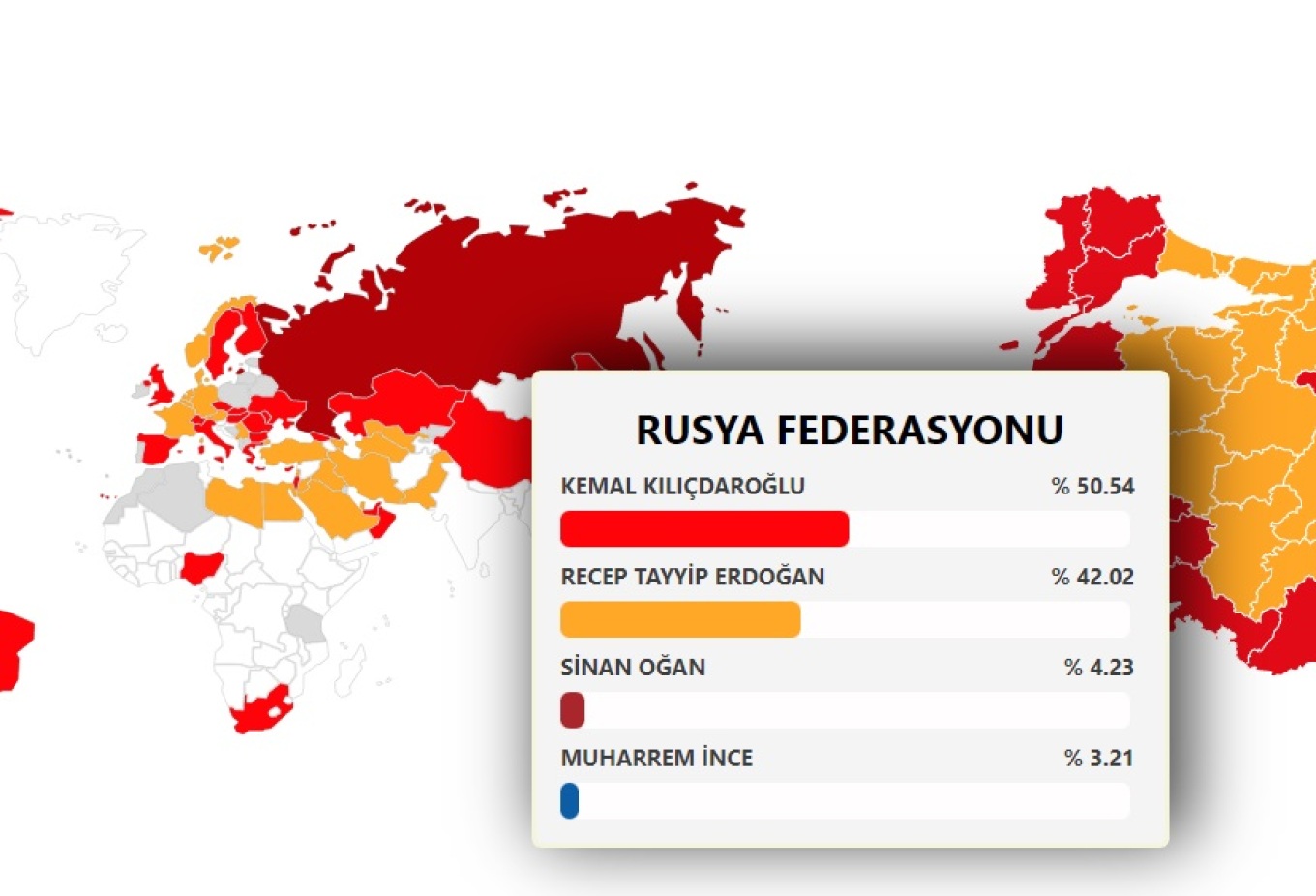 Ανατροπή στη Ρωσία, με τις ψήφους των Τούρκων του εξωτερικού. Πιο συγεκριμένα ο Κεμάλ Κιλιτσντάρογλου, ο οποίος νωρίτερα το βράδυ της Κυριακής ήταν δεύτερος στις ψήφους, πλέον αποσπά το 50,54%. Την ίδια στιγμή ο πρόεδρος της Τουρκίας Ρετζέπ Ταγίπ Ερντογάν έπεται στη δεύτερη θέση με 42,02%.
