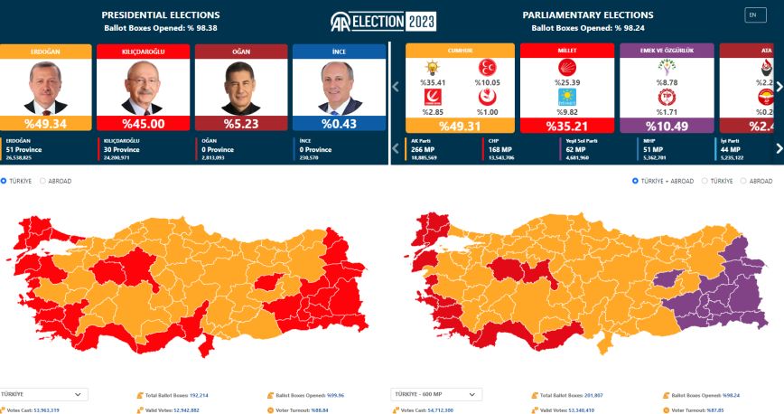 Όμως, κατά τα αποτελέσματα με το 95% των ψηφοδελτίων να έχει καταμετρηθεί, λάμβανε μόλις το 45% των ψήφων ως τις 03:30 [τοπική ώρα και ώρα Ελλάδας]. Η συμμαχία του αμφισβήτησε αμέσως τον αριθμό αυτό, υποστηρίζοντας πως αποκρύπτεται μέρος των ψήφων υπέρ του από τα συστήματα του ανώτερου εκλογικού συμβουλίου (YSK, η εθνική εφορευτική επιτροπή της Τουρκίας).