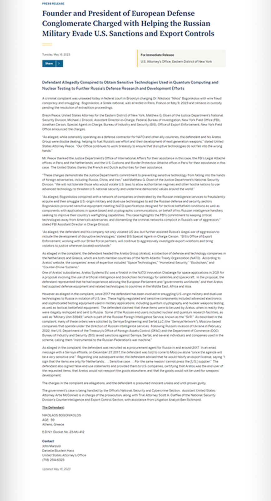 Ο κ. Μπογονικολός συνελήφθη στο Παρίσι στις 9 Μαΐου 2023 και παραμένει υπό κράτηση εν αναμονή της διευθέτησης της διαδικασίας έκδοσής του στις ΗΠΑ.