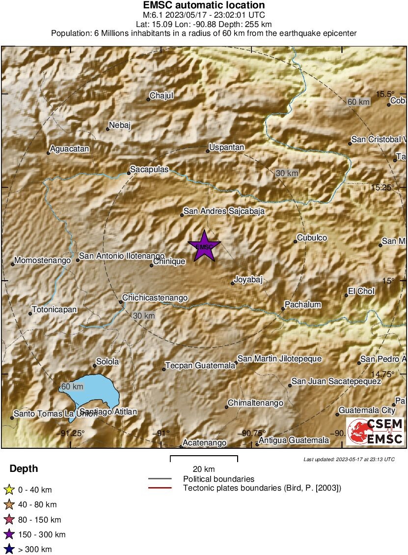 Ισχυρός σεισμός σημειώθηκε στη Γουατεμάλα, αργά το βράδυ της Τετάρτης (17/5) ταρακουνώντας μεγάλο μέρος της χώρας της κεντρικής Αμερικής και το νότιο Μεξικό, πάντως το μεγάλο εστιακό βάθος του (252 χιλιόμετρα) εκτιμάται πως είχε αποτέλεσμα να μη σημειωθούν καταστροφές.