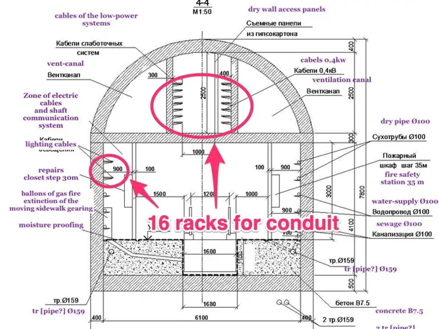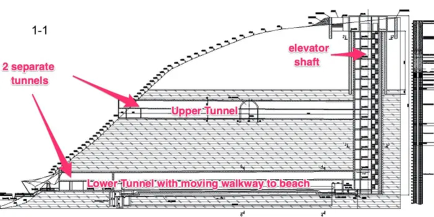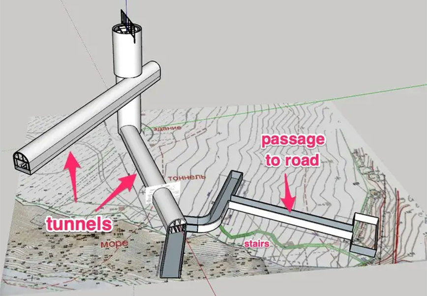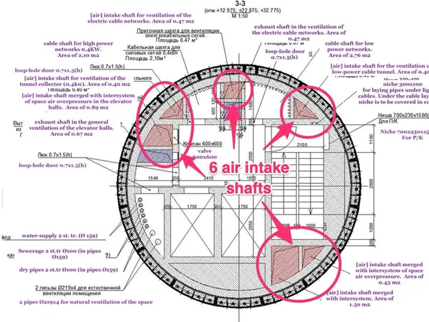 Οι σήραγγες του καταφυγίου που βρίσκονται σε διαφορετικά επίπεδα συνδέονται με ανελκυστήρες και έχουν μήκος περίπου 40 και 60 μέτρα, ενώ το πλάτος τους είναι 6 μέτρα. Ο υπόγειος χώρος διαβίωσης έχει μέγεθος σχεδόν 600 τμ.